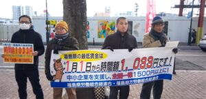 福島県労連と福島地方労連は、1月6日昼、福島駅前で、福島県最低賃金の改定を知らせる宣伝行動を実施しました。1月1日から、時間額1033円に上がったことや福島県が2月から受付を開始する「賃上げ支援金」事業についても、お知 […]